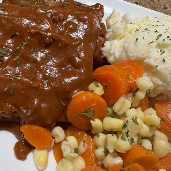 Juicy , delicious and smothered in our own rich beef ‘n tomato gravy served with house made chunky red skin whipped potatoes made with real cream with a buttery vegetable medley of sweet carrots and white shoe peg corn.